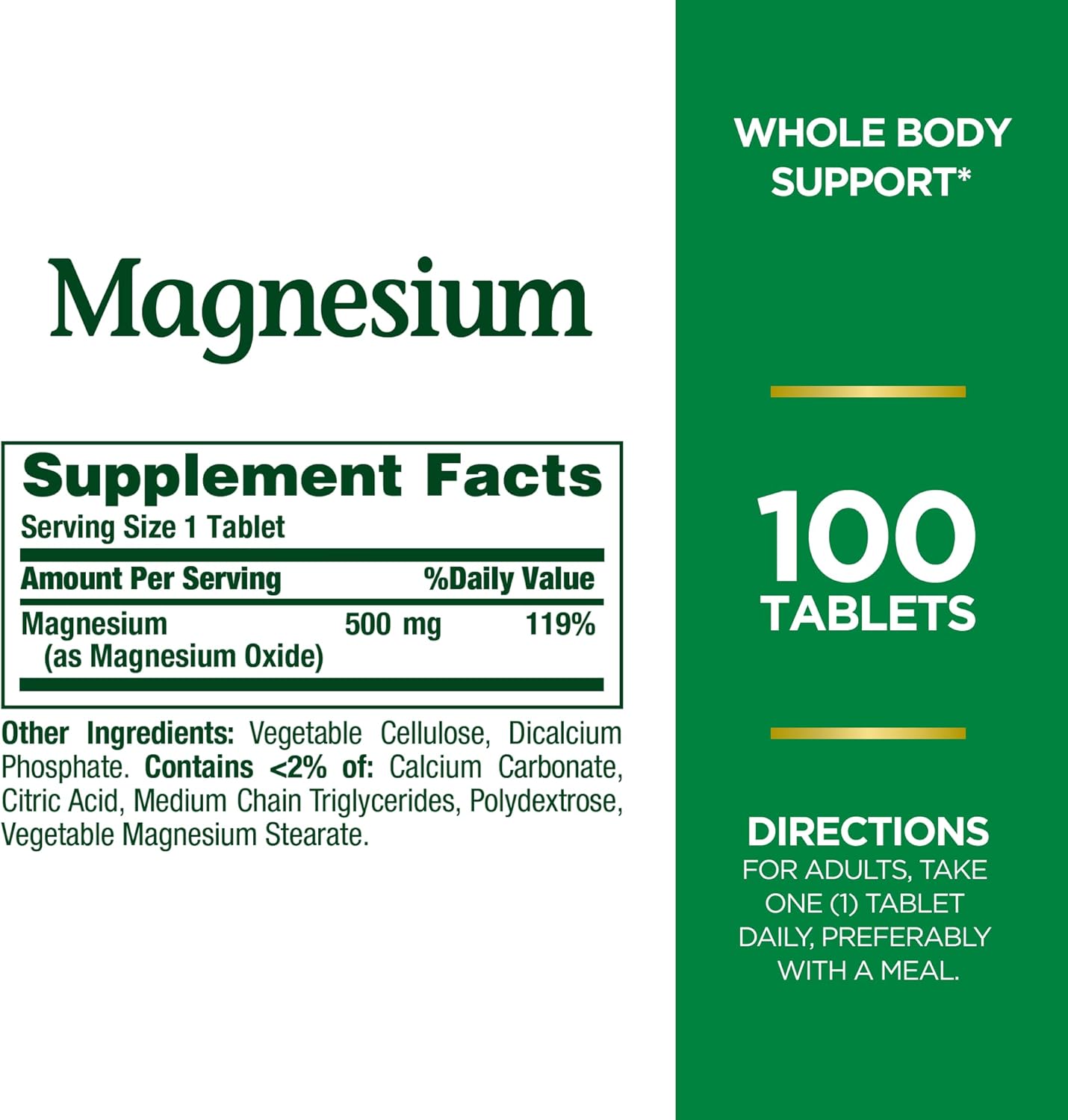 - Contains bottles of 100 coated tablets of Nature's Bounty 500mg Magnesium mineral supplements; Tablets are coated for easy swallowing and support bone and muscle health (1)