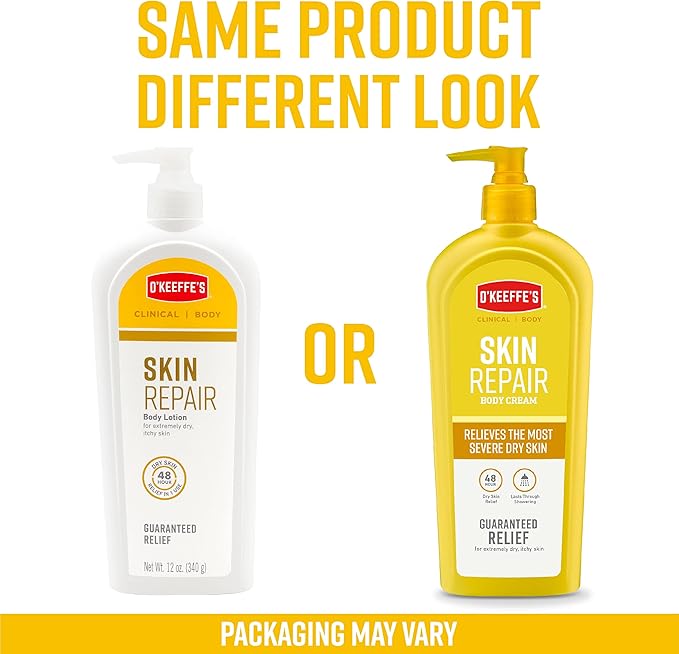 - O'Keeffe's Skin Repair heals, relieves, and repairs extremely dry, itchy skin; Packaging may arrive in white or gold colored bottles