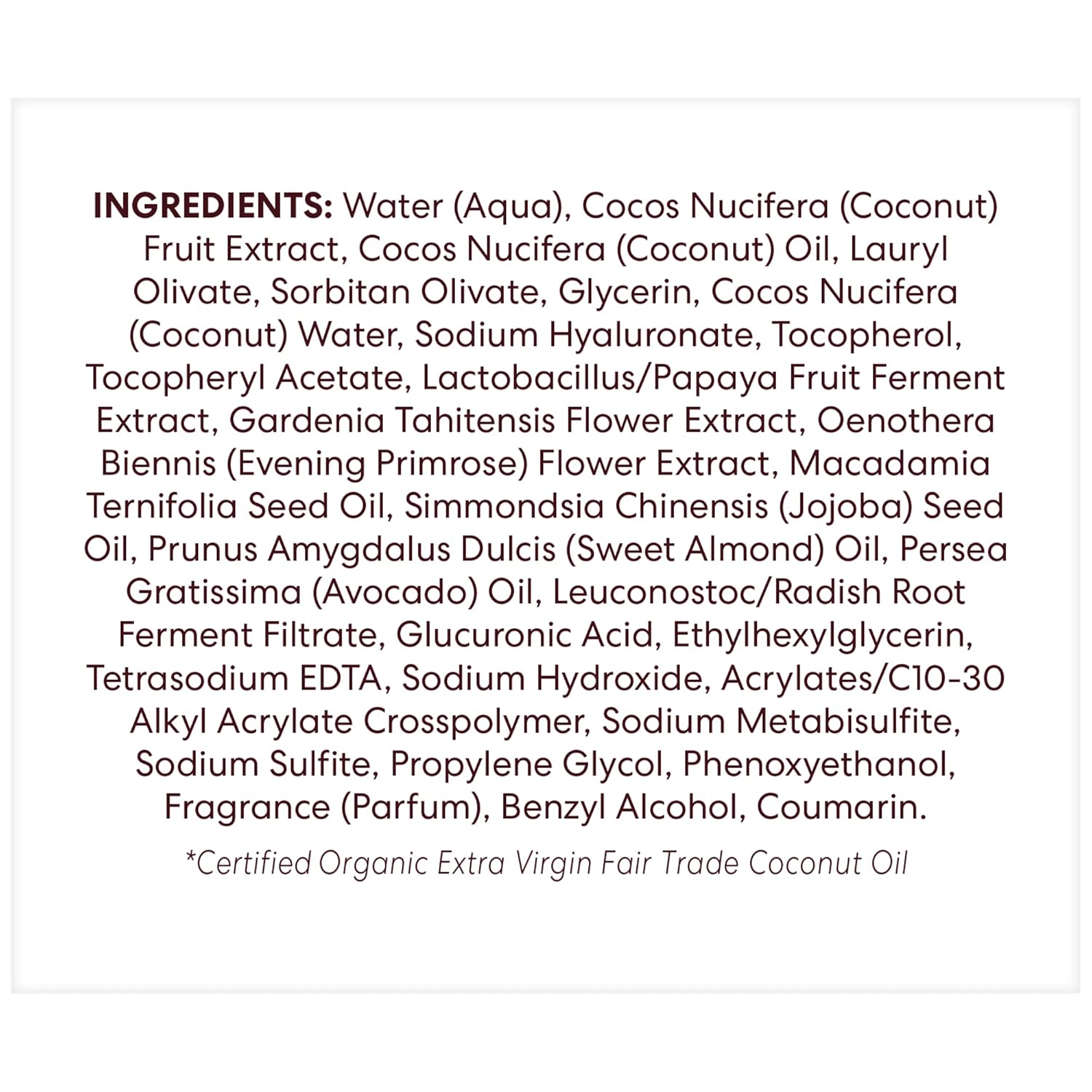 - Revitalizing Formula: Infused with coconut water, hyaluronic acid, and papaya enzymes, this facial moisturizer is ethically formulated and it is made with sustainably sourced organic coconut oil